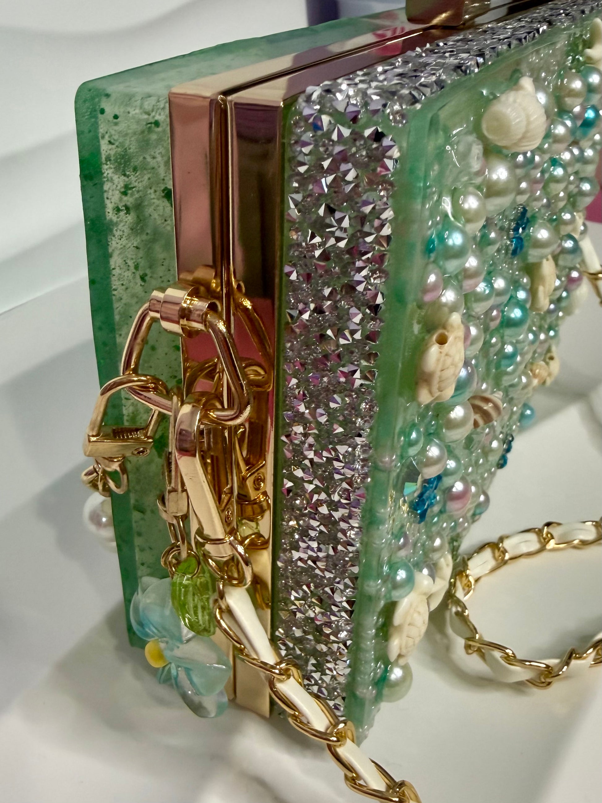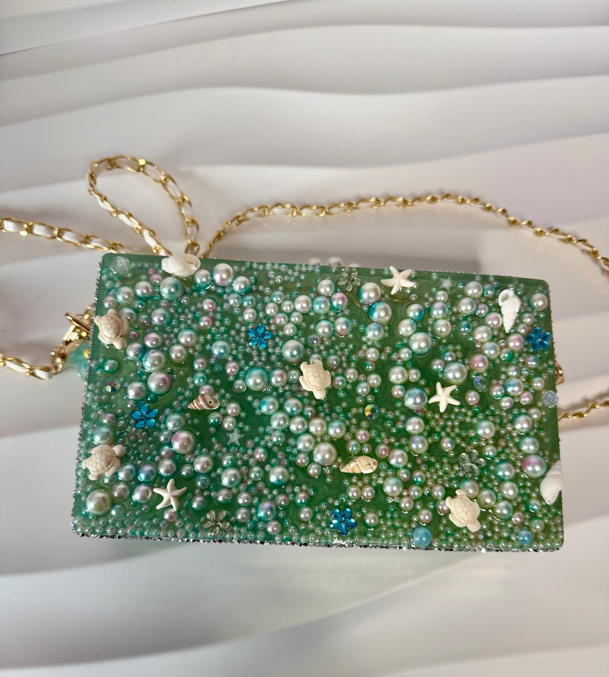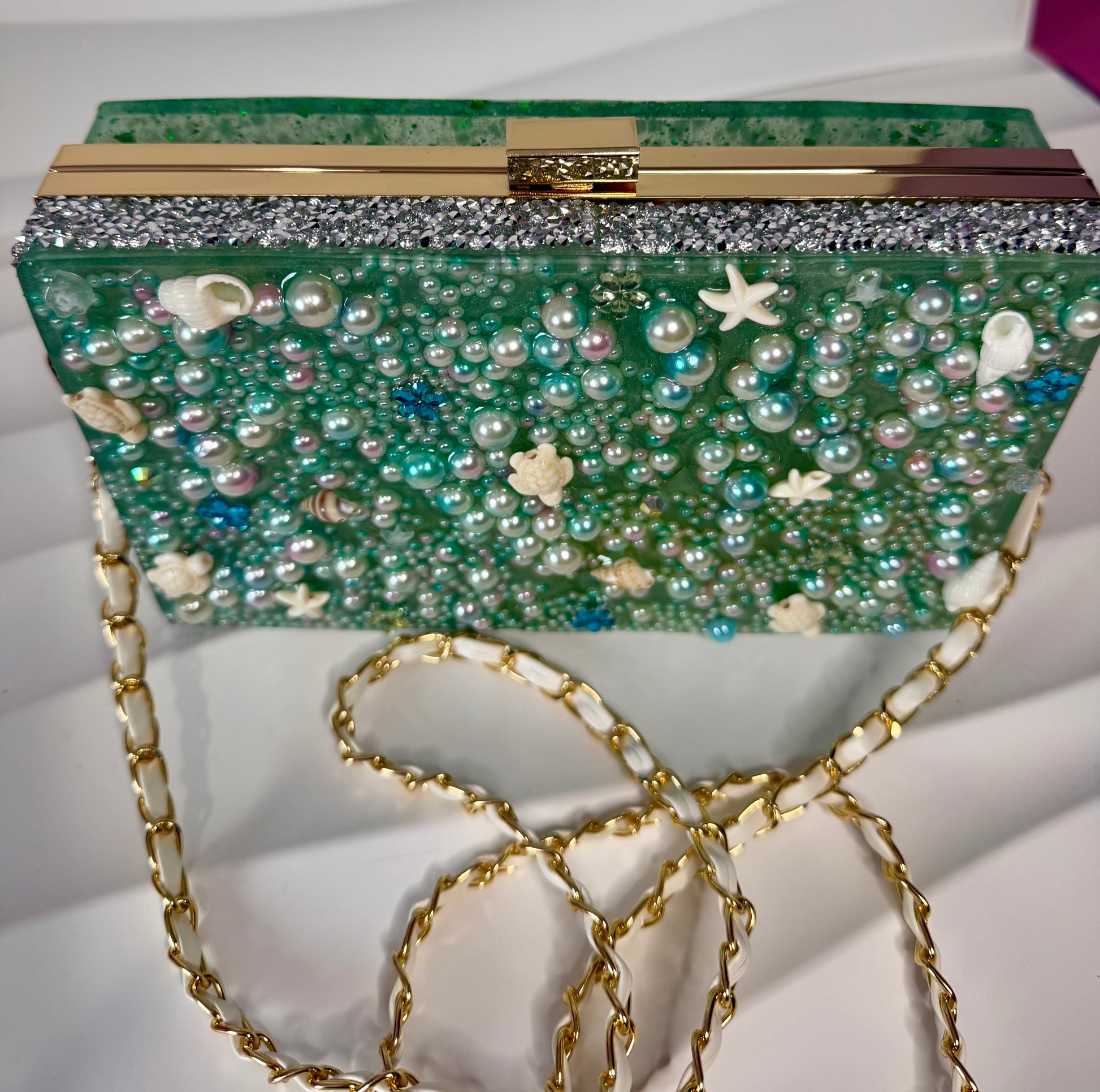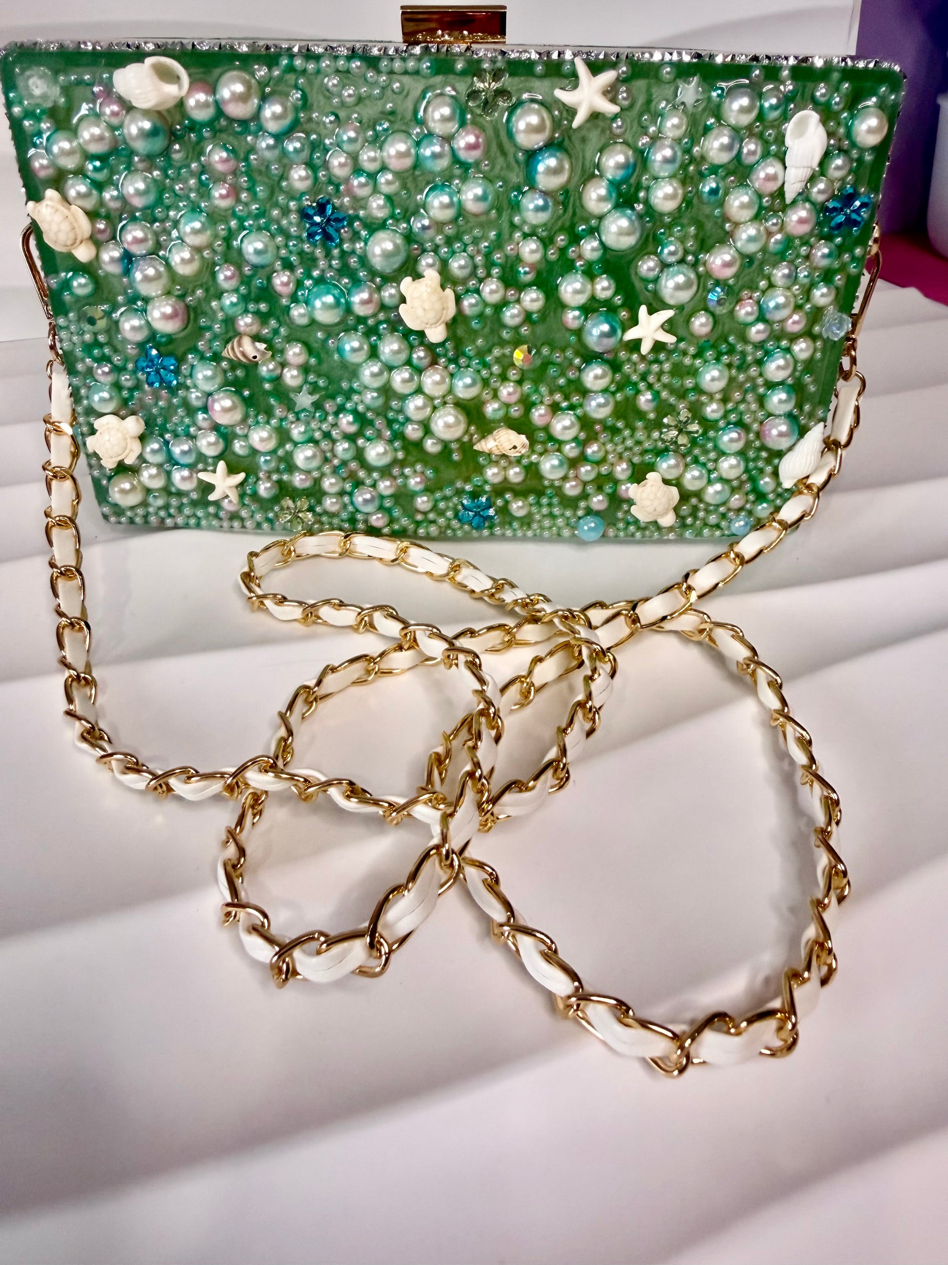 This handmade resin clutch features a mesmerizing display of tiny, shimmering pearls, like bubbles floating through a magical sea. The long gold chain and complementary pearl-and-gold short chain add a touch of elegance, making it perfect for a night out or adding a unique flair to any outfit. Occasional use only advised. Comes with it's own dust bag to keep safe and out of sunlight.