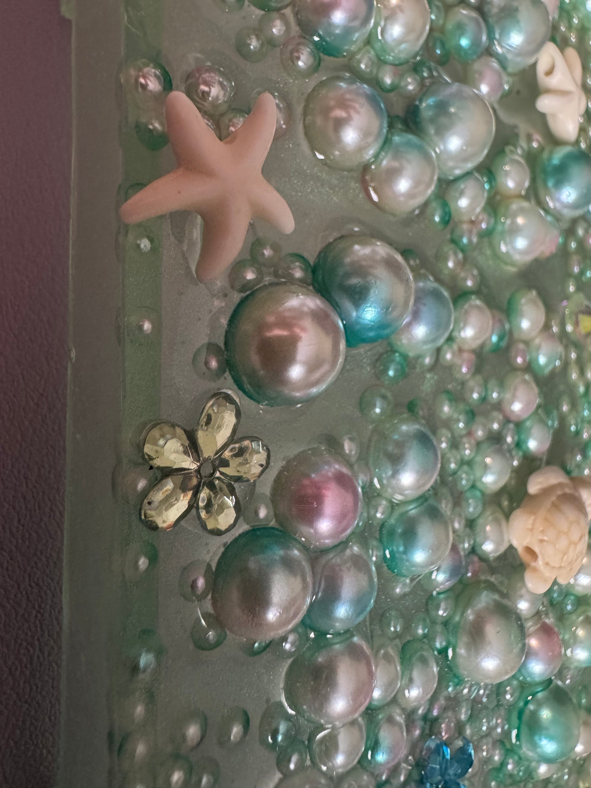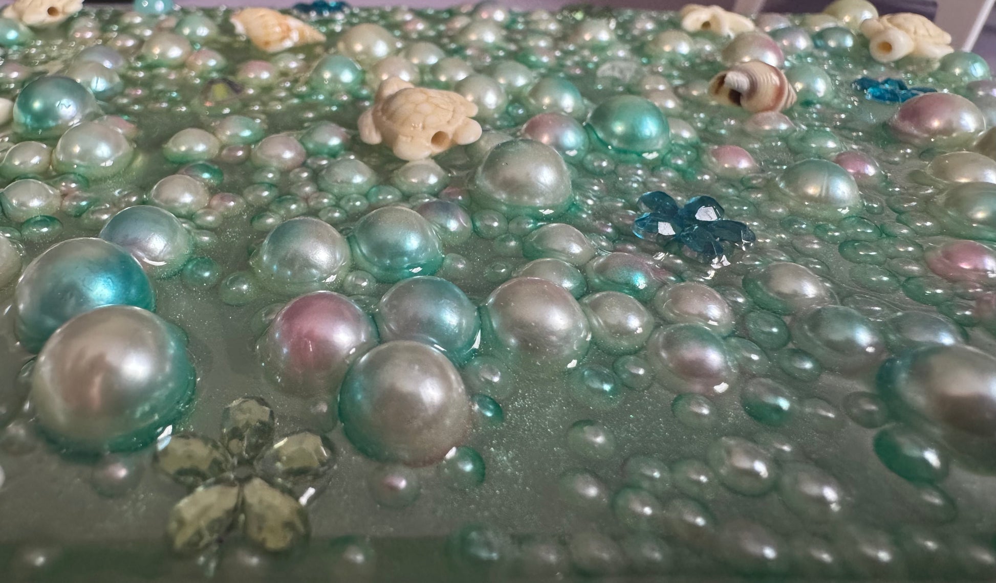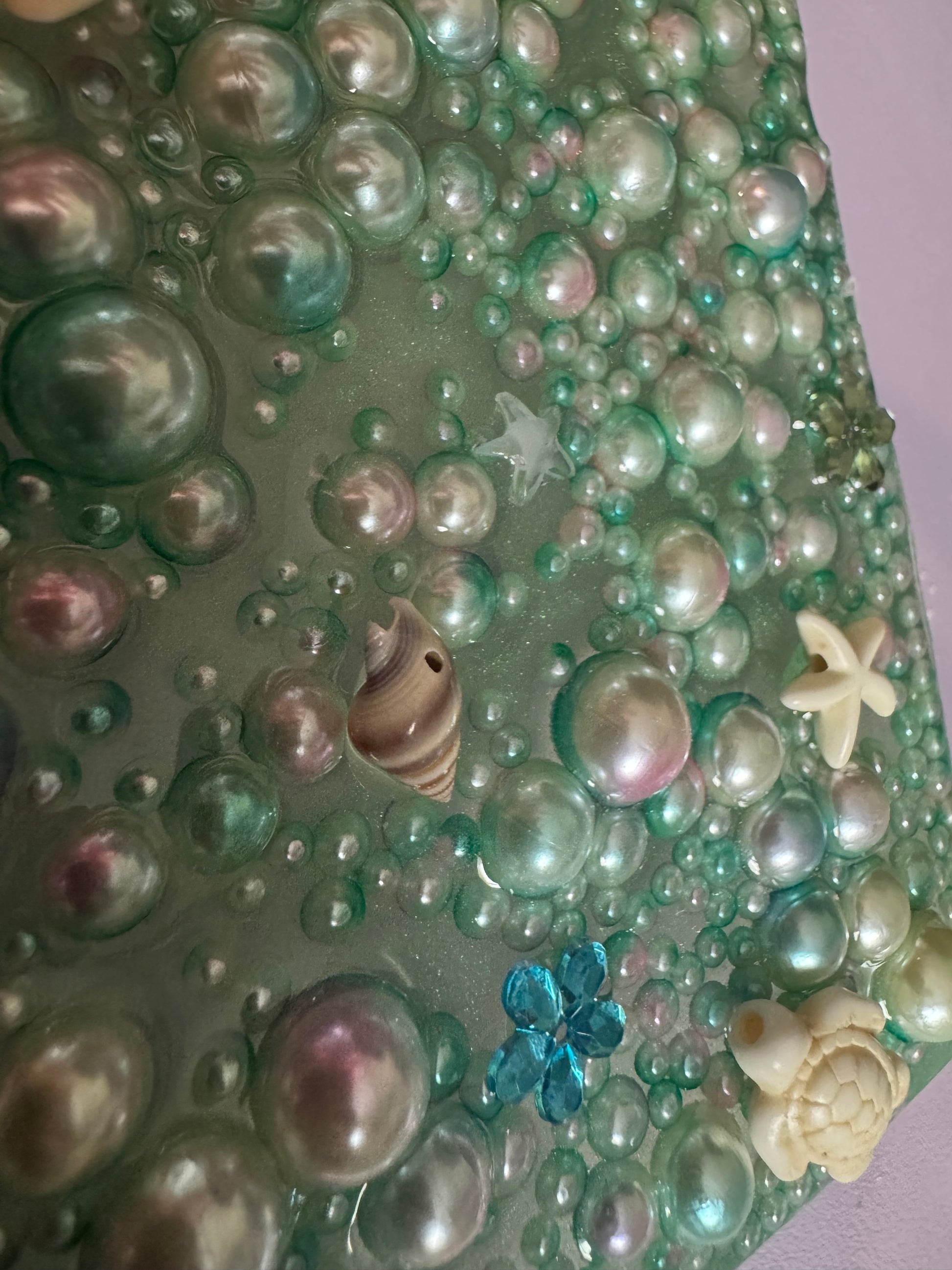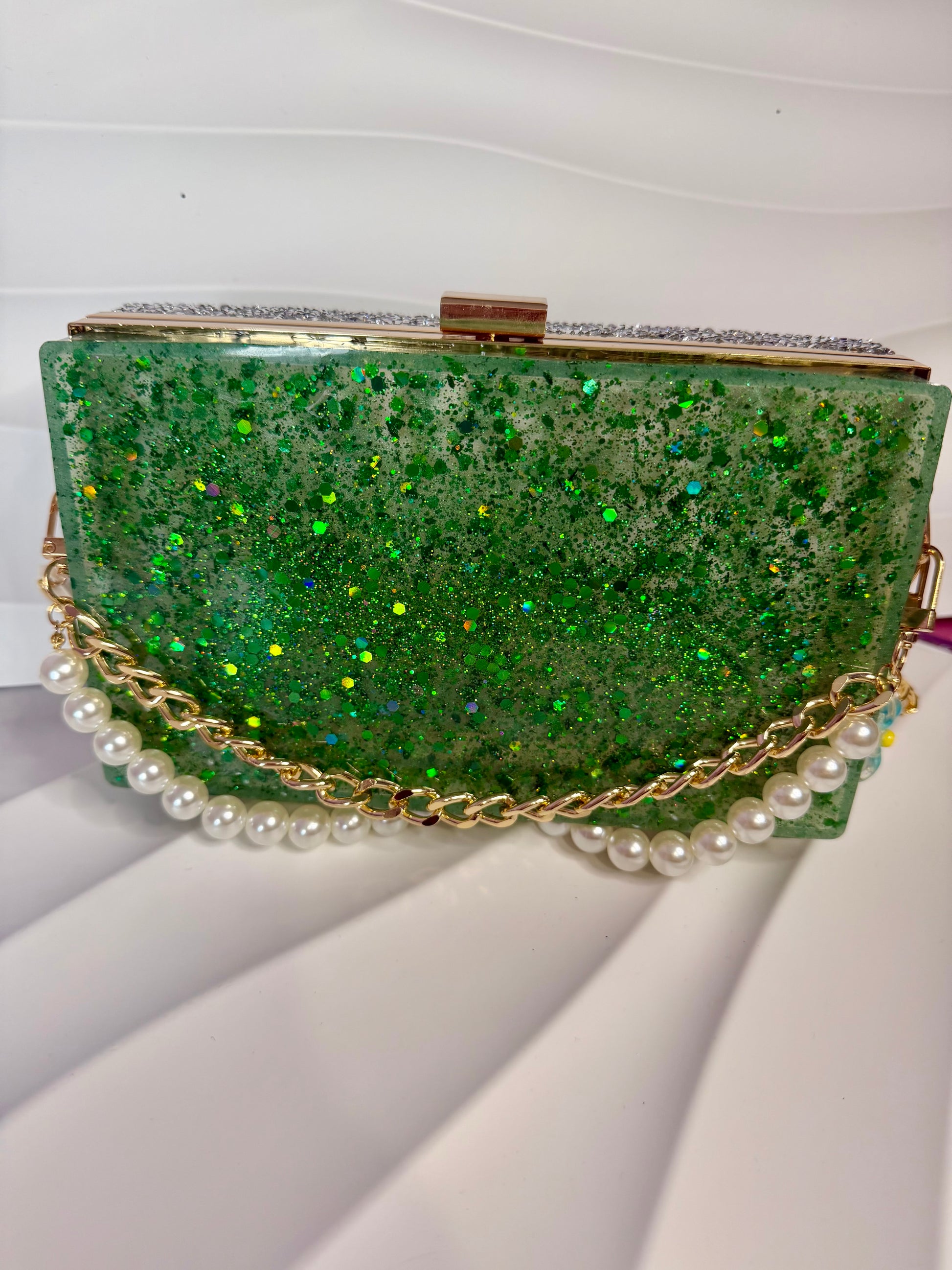 This handmade resin clutch features a mesmerizing display of tiny, shimmering pearls, like bubbles floating through a magical sea. The long gold chain and complementary pearl-and-gold short chain add a touch of elegance, making it perfect for a night out or adding a unique flair to any outfit. Occasional use only advised. Comes with it's own dust bag to keep safe and out of sunlight.