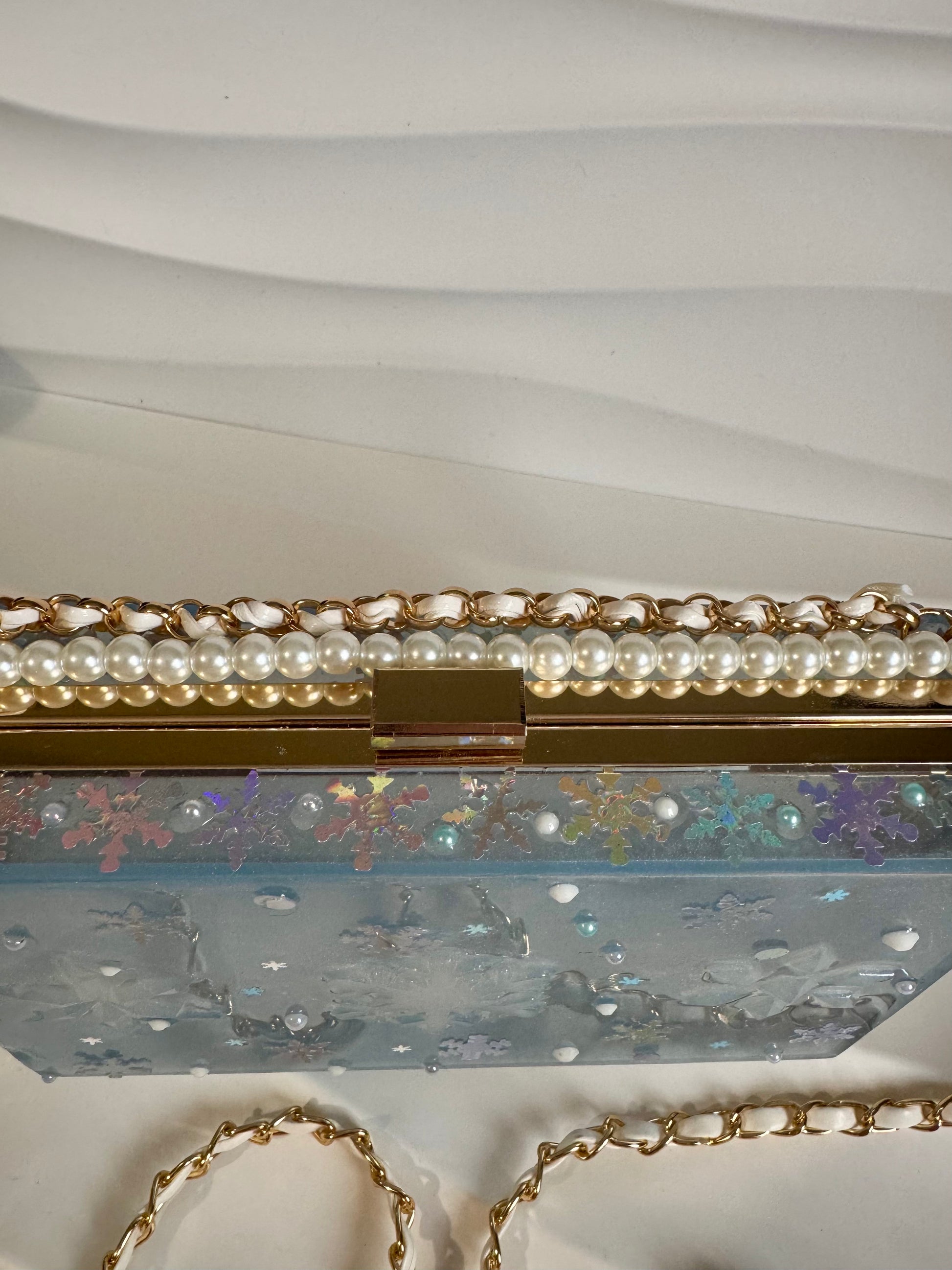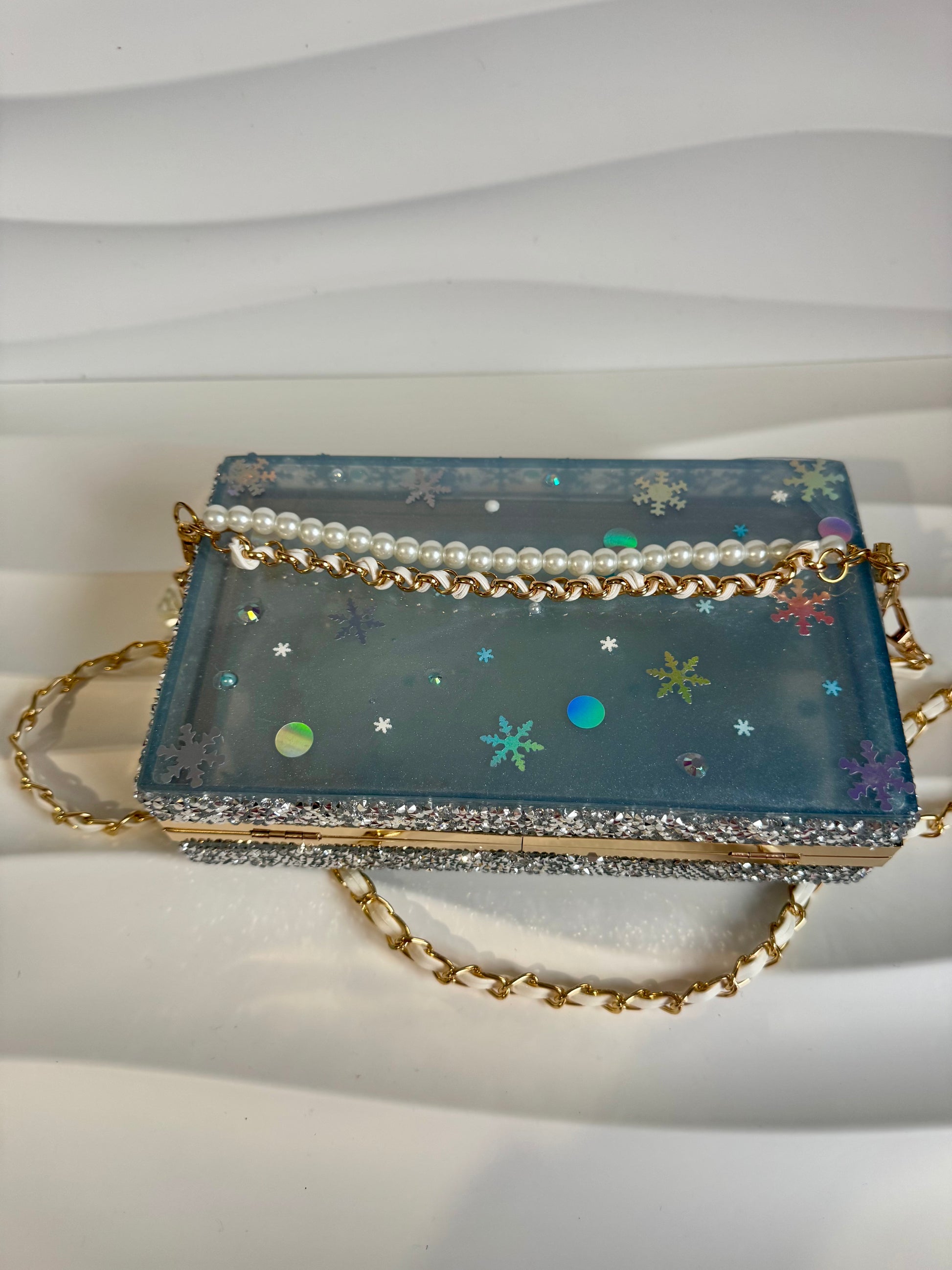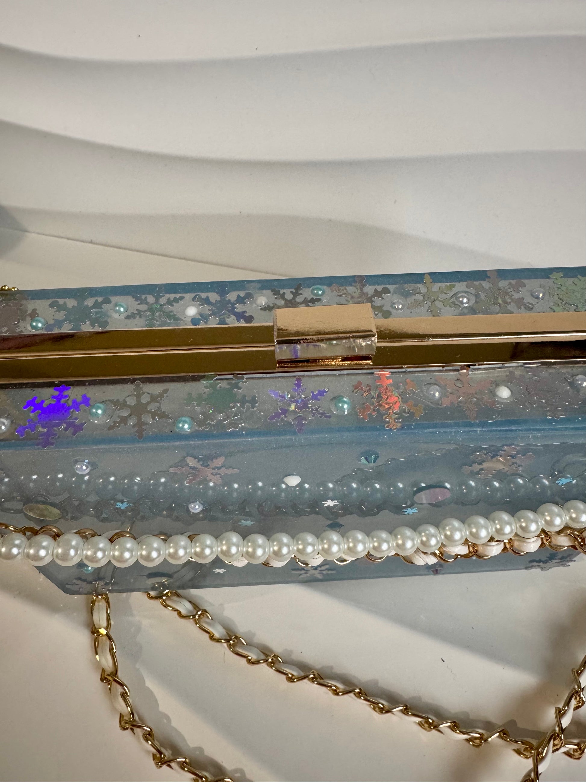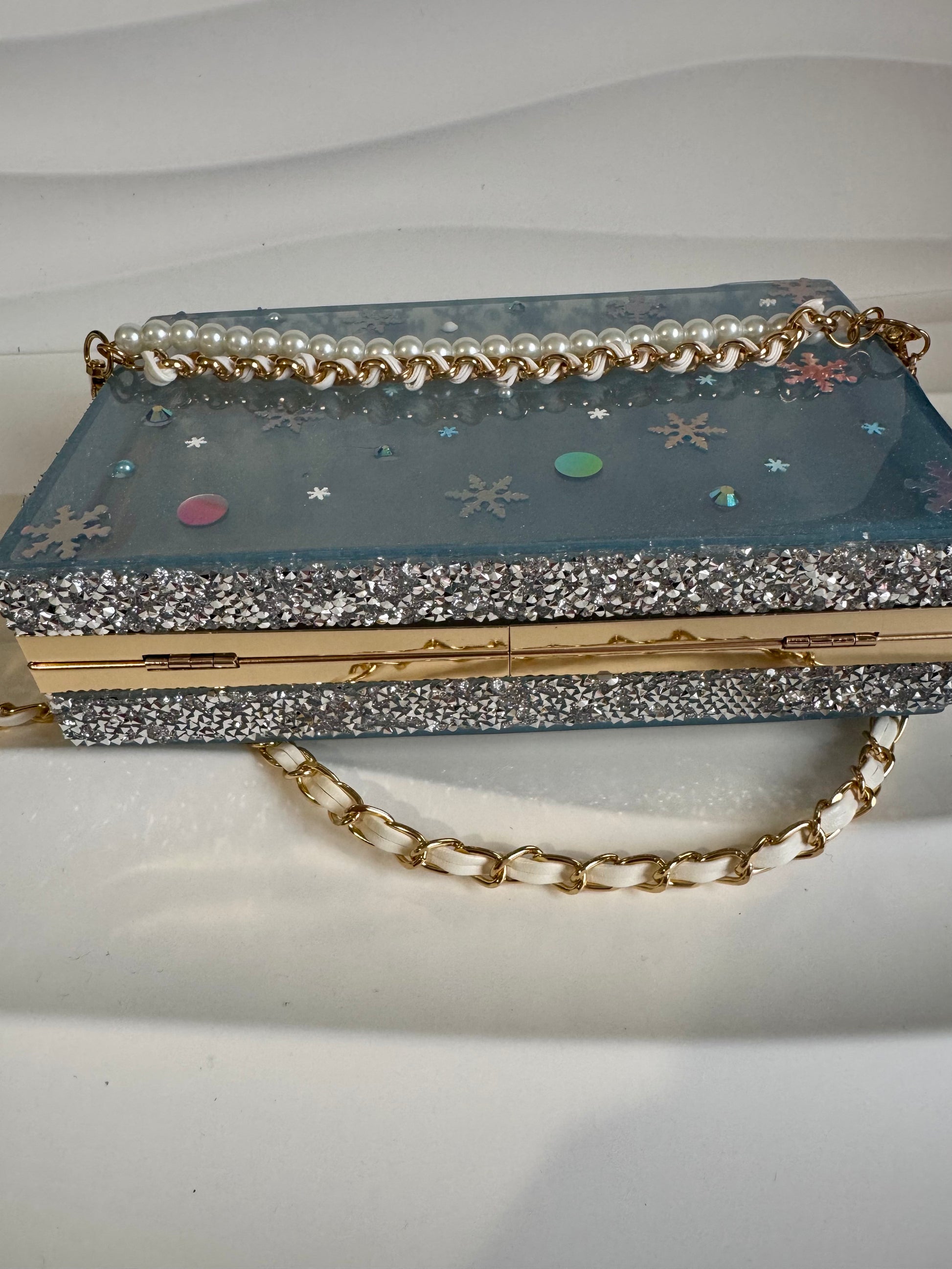 Inspired by the serene beauty of a snowy landscape, the Glacial Glamour bag is a true work of art. The translucent, icy-blue resin is filled with shimmering snowflakes and tiny pearls, evoking a feeling of winter magic. The ends are encrusted with sparkling rhinestones, mimicking the look of glittering ice. Adorned with a luxurious pearl and gold chain, a charming bow, and a delicate flower charm, this bag is a unique accessory that brings a touch of dazzling elegance to any look. Occasional use only advised. Comes with it's own dust bag to keep safe and out of sunlight.