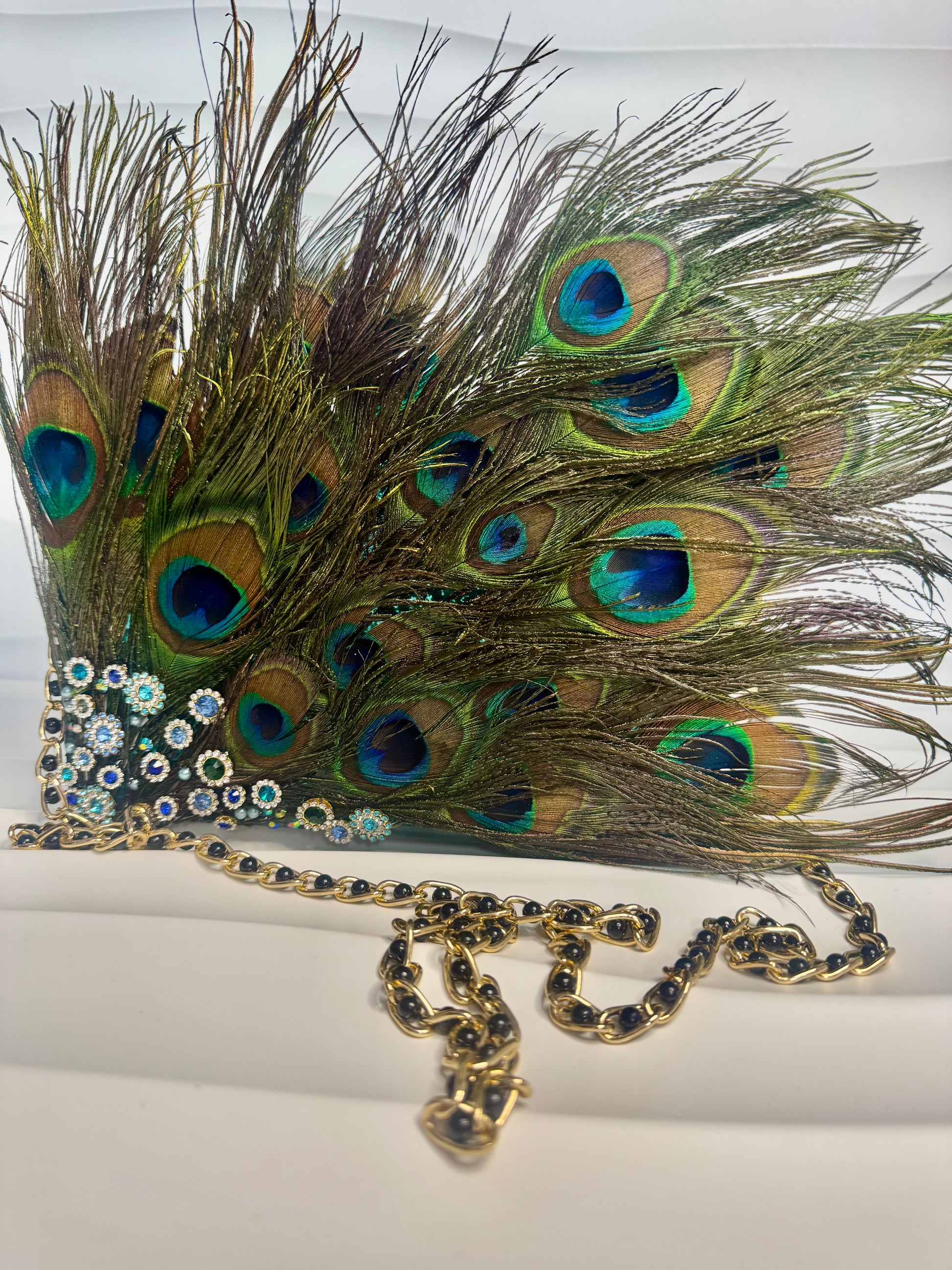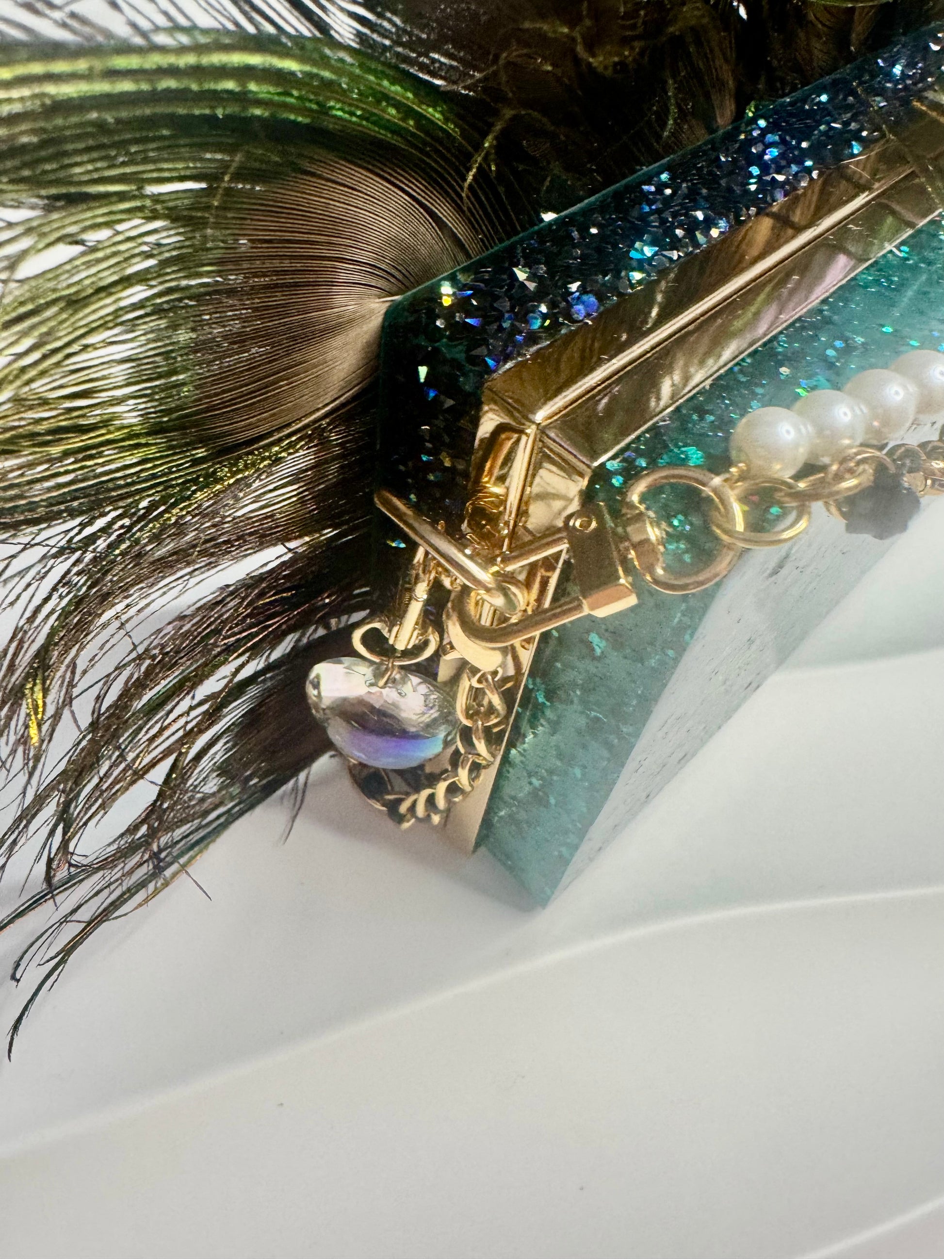 Inspired by the majestic beauty of the peacock, the Plume and Pearl bag is an opulent masterpiece. This handmade resin clutch features a dramatic display of natural peacock feathers, creating a bold and luxurious texture. The body of the bag shimmers with rich teal and emerald glitter, reminiscent of the peacock's iridescent plumage. Adorned with a delicate pearl chain, a sturdy gold chain, and sparkling charms, this bag is designed for those who dare to stand out and embrace their unique style. Occasional use only advised. Comes with it's own dust bag to keep safe and out of sunlight.