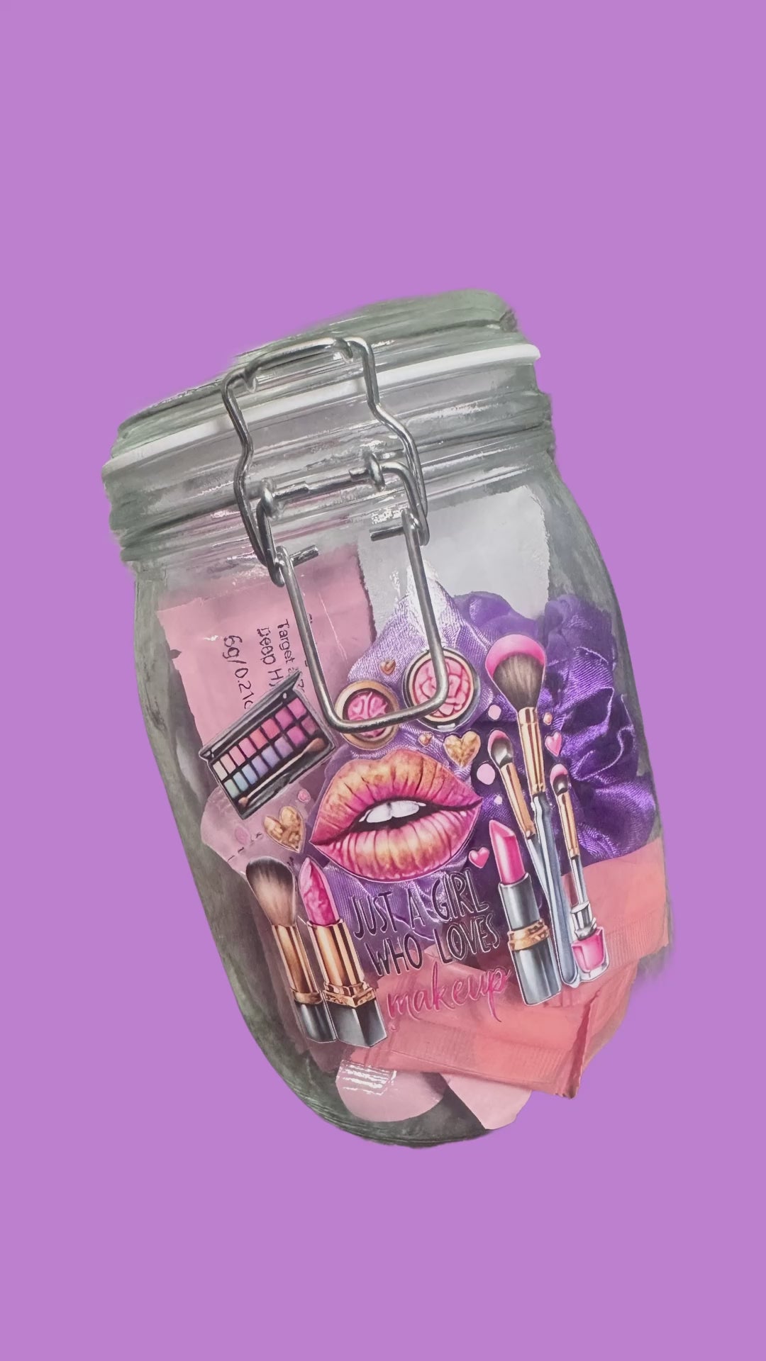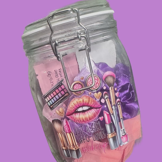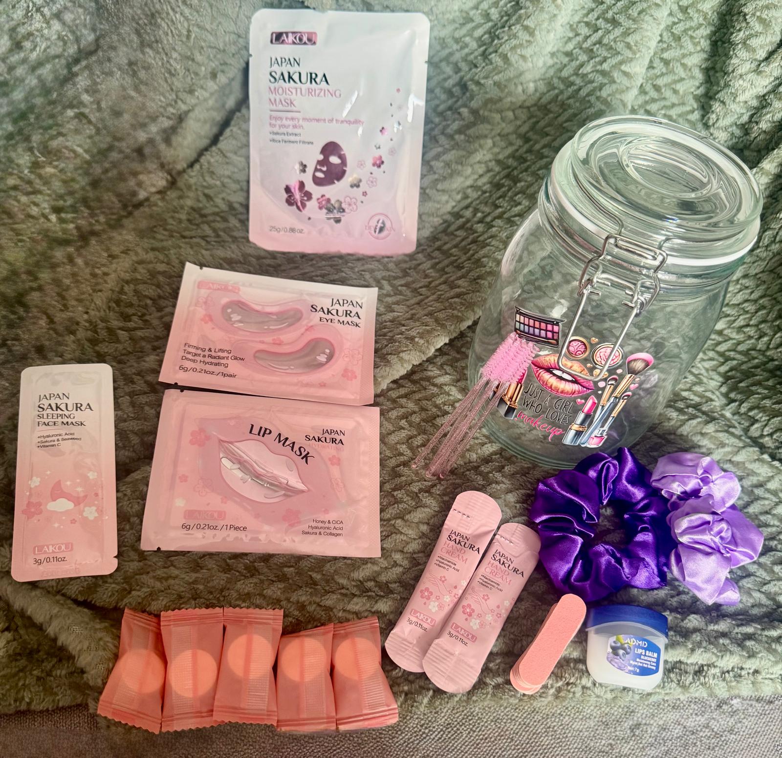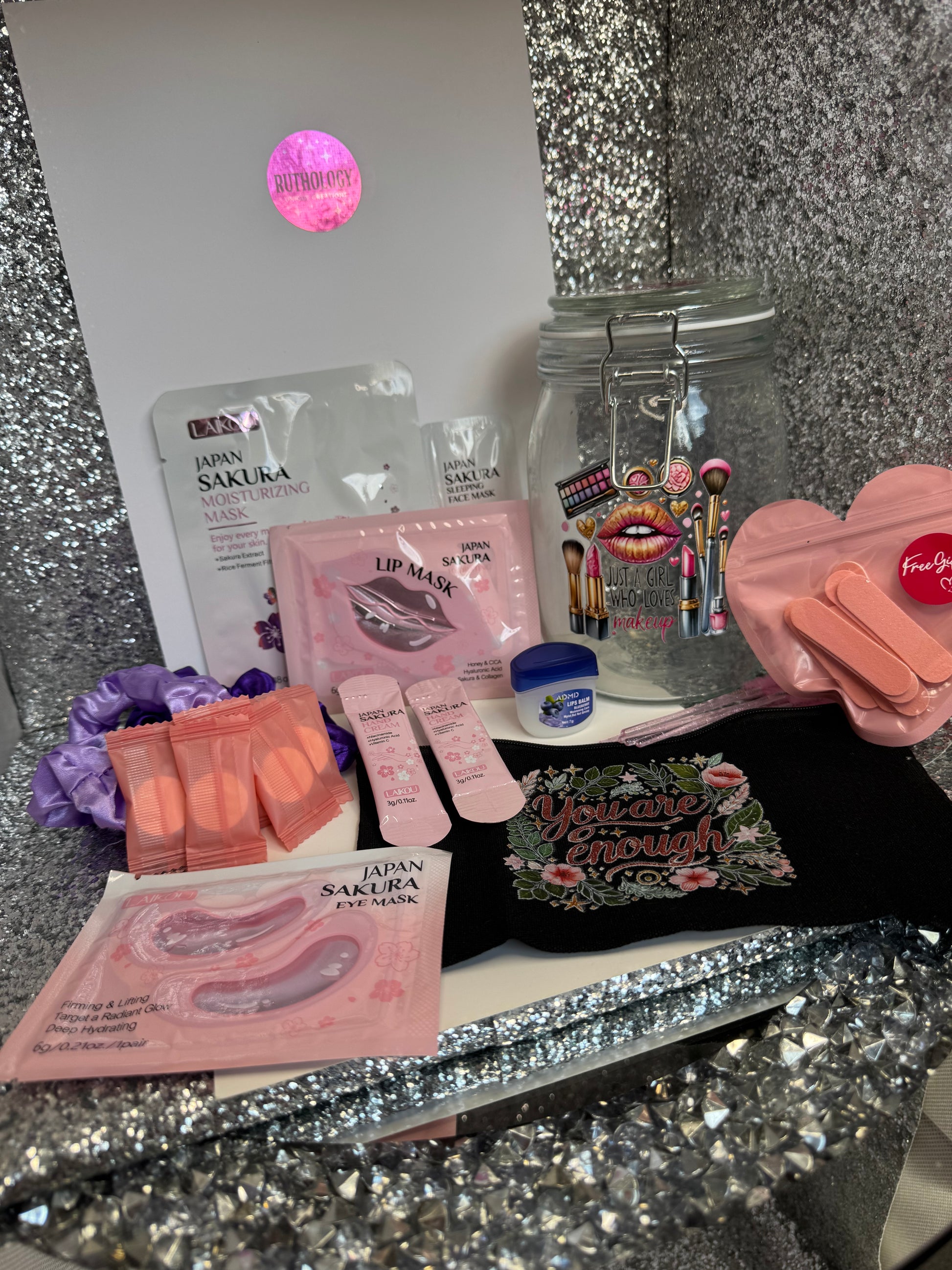 Our cutest beauty jar, 1 Lip Balm, 1 Eye Mask, 2 Hand Cream, 1 Lip Mask , 1 Sleep Mask, 2 Scrunchies, 10 Mini files, 5 Disposable towels, 5 Mascara wands and 1 small make up remover cloth